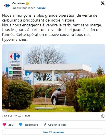 Quelques heures après, Carrefour a annoncé une mesure similaire, présentée comme «la plus grande opération de vente de carburant à prix coûtant de (son) histoire». L’enseigne s’engageant à vendre le carburant «sans marge, tous les jours, à partir de ce vendredi, et jusqu'à la fin de l'année». «Cette opération massive couvrira tous nos hypermarchés», précise Carrefour sur X.