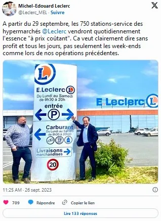 "A partir du 29 septembre, les 750 stations-service des hypermarchés @Leclerc vendront quotidiennement l'essence "à prix coûtant". Ca veut clairement dire sans profit et tous les jours, pas seulement les week-ends comme lors de nos opérations précédentes.", a précisé sur X le président du comité stratégique des centres E.Leclerc.