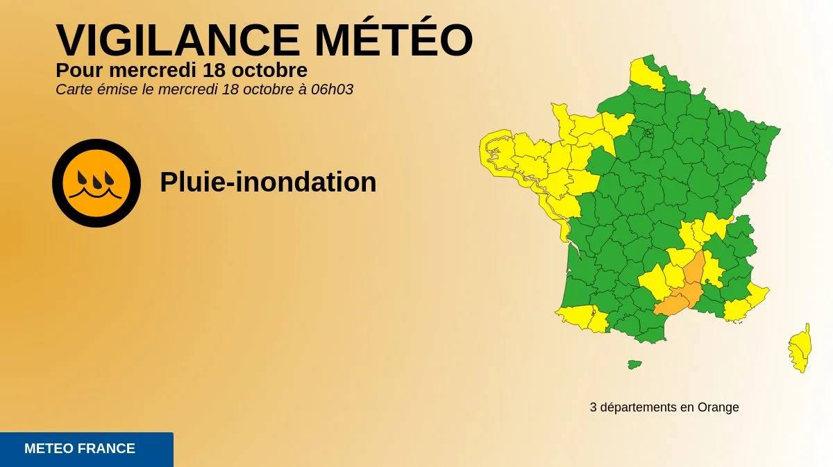 De fortes pluies orageuses sont attendues ce mercredi 18 octobre. Météo France a placé trois départements en vigilance orange pluie-inondation: le Gard, l'Hérault et l'Ardèche. Jusqu’à 250mm d’eau sont attendus dans le massif des Cévennes, au moins 50mm sur le littoral. Le phénomène concernera d'abord l'Hérault et le Gard dans la matinée, puis s'étendra dans l'après-midi et dans la nuit à l'Ardèche.