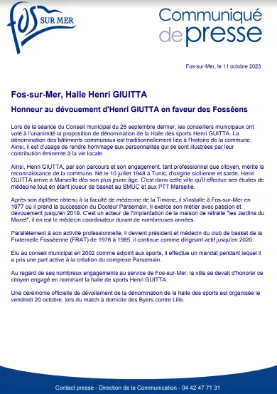 Le conseil municipal de Fos-sur-Mer a voté à l’unanimité pour cette nouvelle appellation de la Halle des Sports. Un hommage au père de Rémi Giuitta, coach actuel des BYers en Pro B. La Halle Parsemain laisse place à la Halle Henri Giuitta.